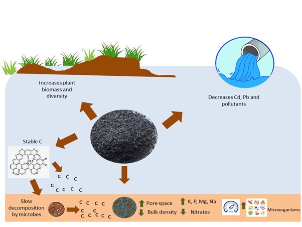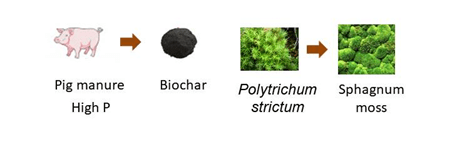 Biochar amendment of wetlands leads to an increase in plant diversity: Biochar derived from pig manure improves phosphorous content of the soil leading to growth of Polytrichum strictum which helps in establishment of sphagnum moss.