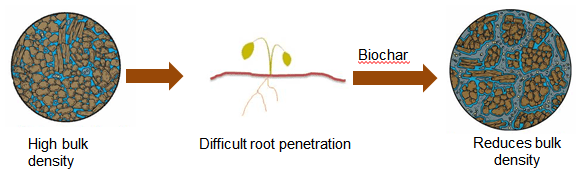 Biochar decreases soil bulk density: Higher soil bulk density reduces the root penetration and ultimately negatively affects plant growth. Though different types of biochar will affect the bulk density differently but overall since biochar has a porous structure, it helps to reduce the soil bulk density.