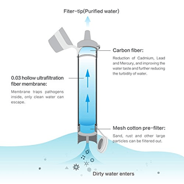 LifeStraw contains PuroTech Disinfecting Resin (PDR) – a patented, extraordinarily effective material which kills bacteria. Presence of active carbon removes parasites.