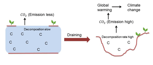 The wetlands cover just 5 to 10 % of the earth’s area, however they are an efficient reservoir for carbon, aid in water purification, habitat for flora and fauna, help in groundwater recharge and significantly reduce the climate change by sequestering carbon dioxide. Draining of wetlands leads to an increase in the decomposition rate of organic carbon. It further leads to release of greenhouse gasses that contribute to the climate change.