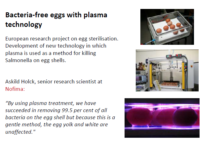 In addition to the food industry applications plasma can also be used for air-water purification, in high tech systems as semiconductor, polymers, as a renewable resource for producing efficient lightening, wound healing and cancer treatment.