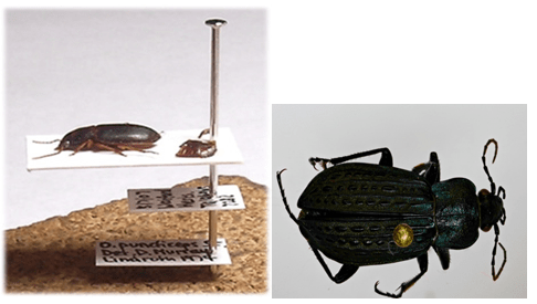 Mostly insects are pinned in the thorax but for beetles and bugs pinning is done at the right side of abdomen. For very small insects like aphids and jassids, double mounting is done, in which firstly the insect is pasted on a piece of hard paper with glue and then a pin is put into the paper.